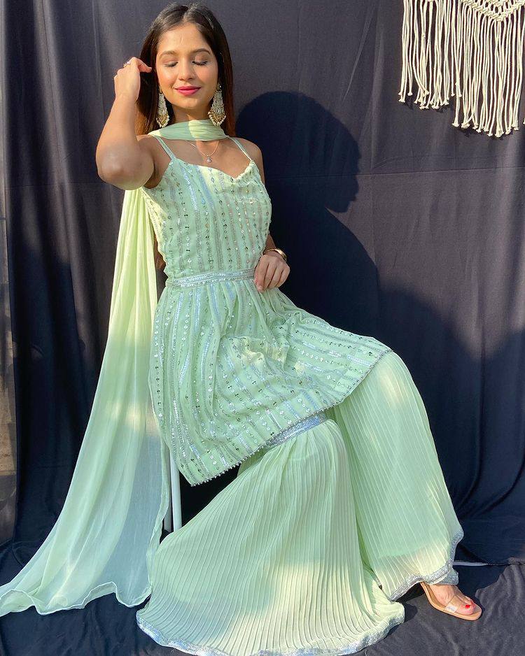 SHARARA FABRIC: HEAVY PURE SOFT FOX GEORGETTE PLEATED FABRIC AND INNER MICRO COTTON FULLY STITCHED LENGTH 39 40