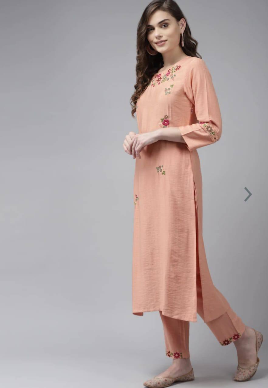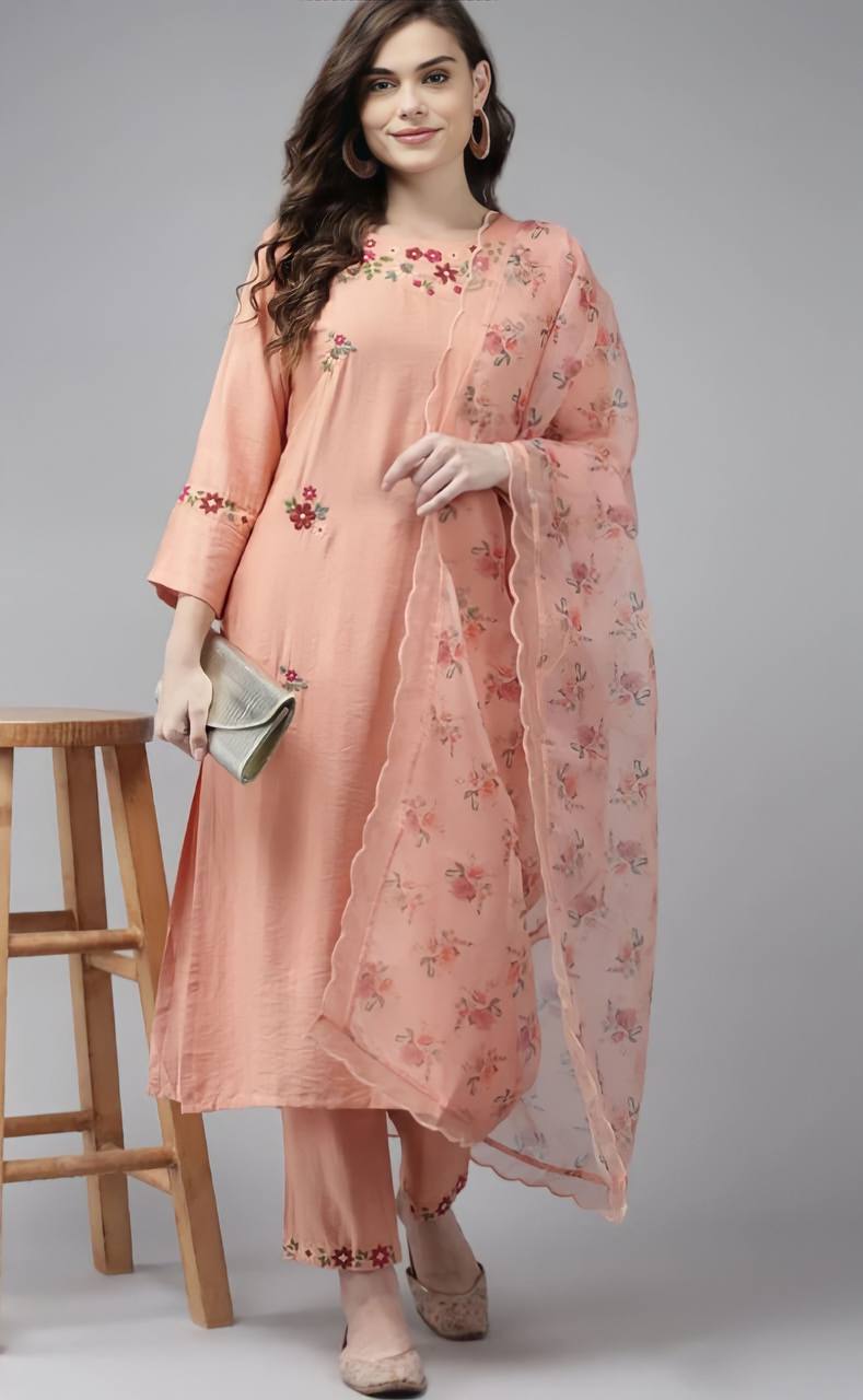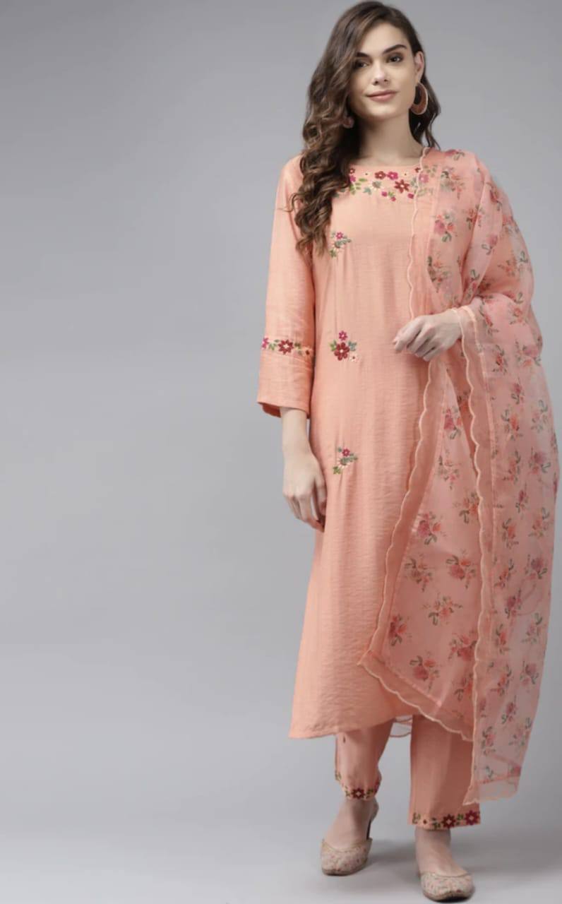 Rayon Slub Peach Embroidery Kurta Set With Printed Dupatta Set