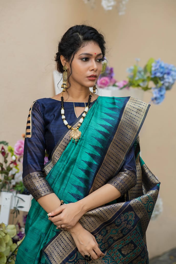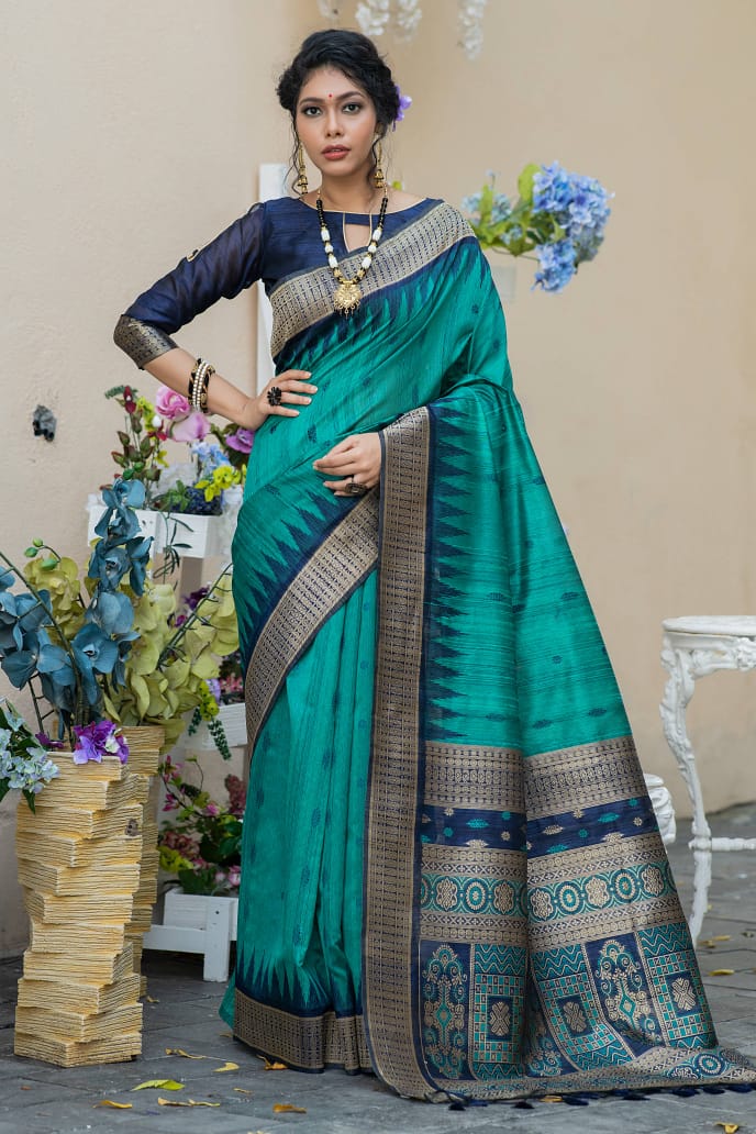 Semi Pure tussur silk weaving saree with Temple woven border small woven butti contrast pallu and blouse piece with exclusive tassels