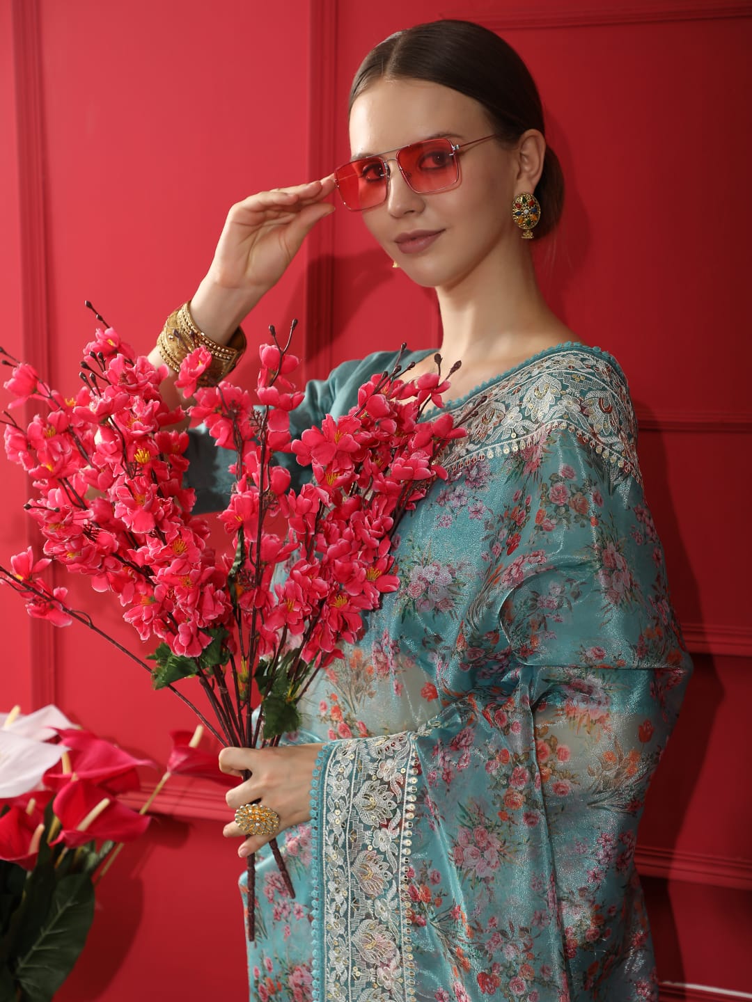 Blue Soft Organza Silk Saree With Fine Sequence Embroidered Border Work