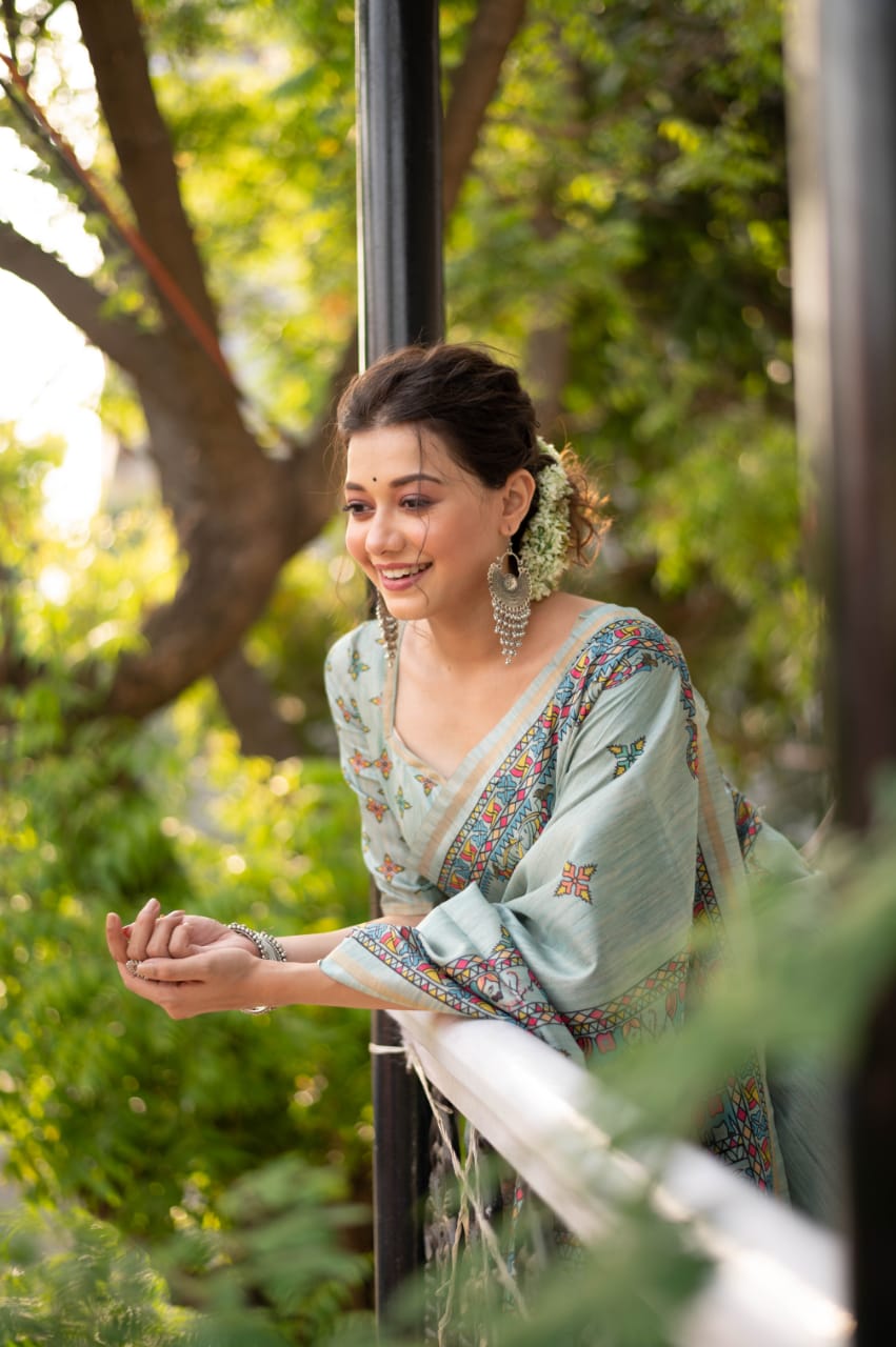 Tussar Silk Saree With Beautiful Madhubani Print And Finished Zari Border With Fancy Pallu And Tassels