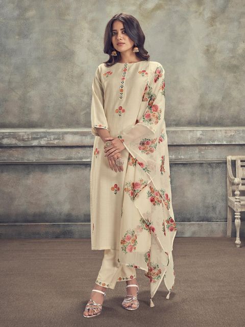 Viscose Rayon Slub Cream Embroidery Kurta Set With Printed Dupatta Set